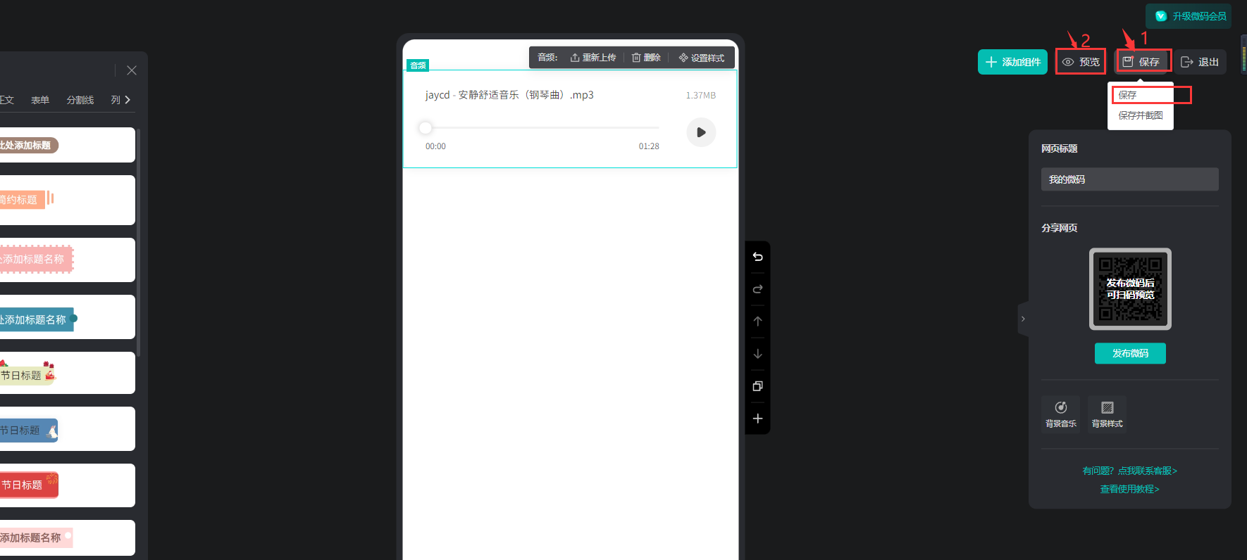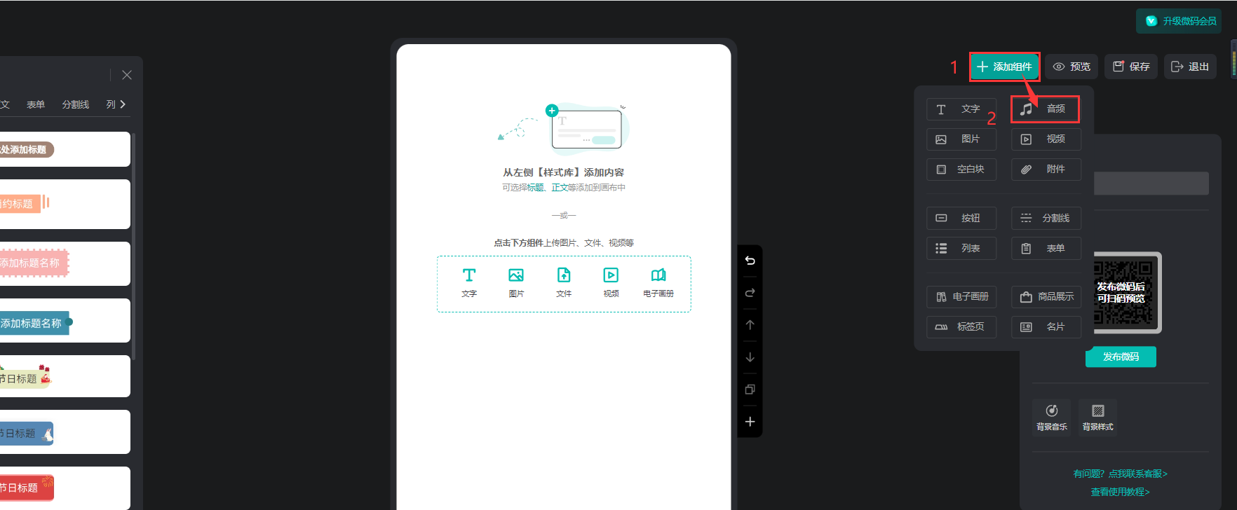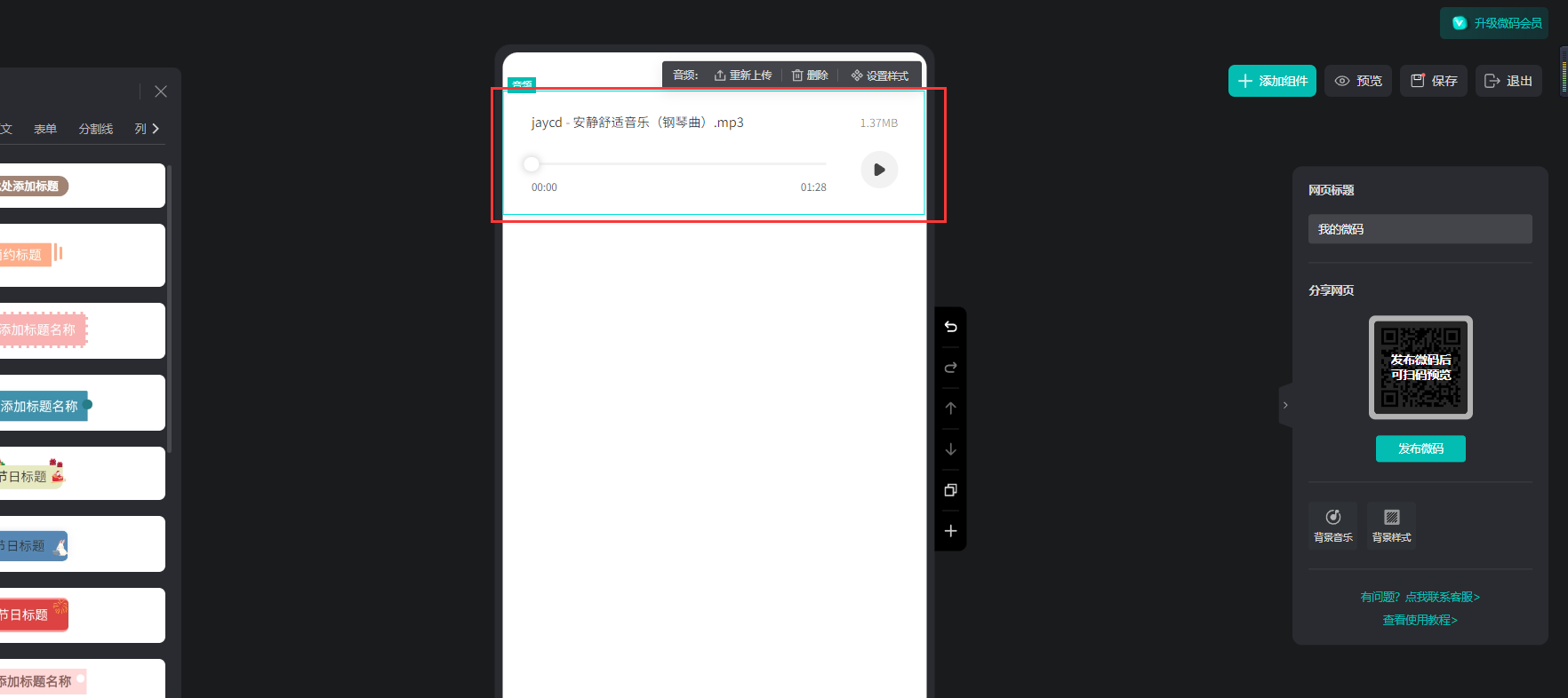 點擊【添加組件】,點擊【音頻】,上傳mp3格式的音頻文件添加到頁面上