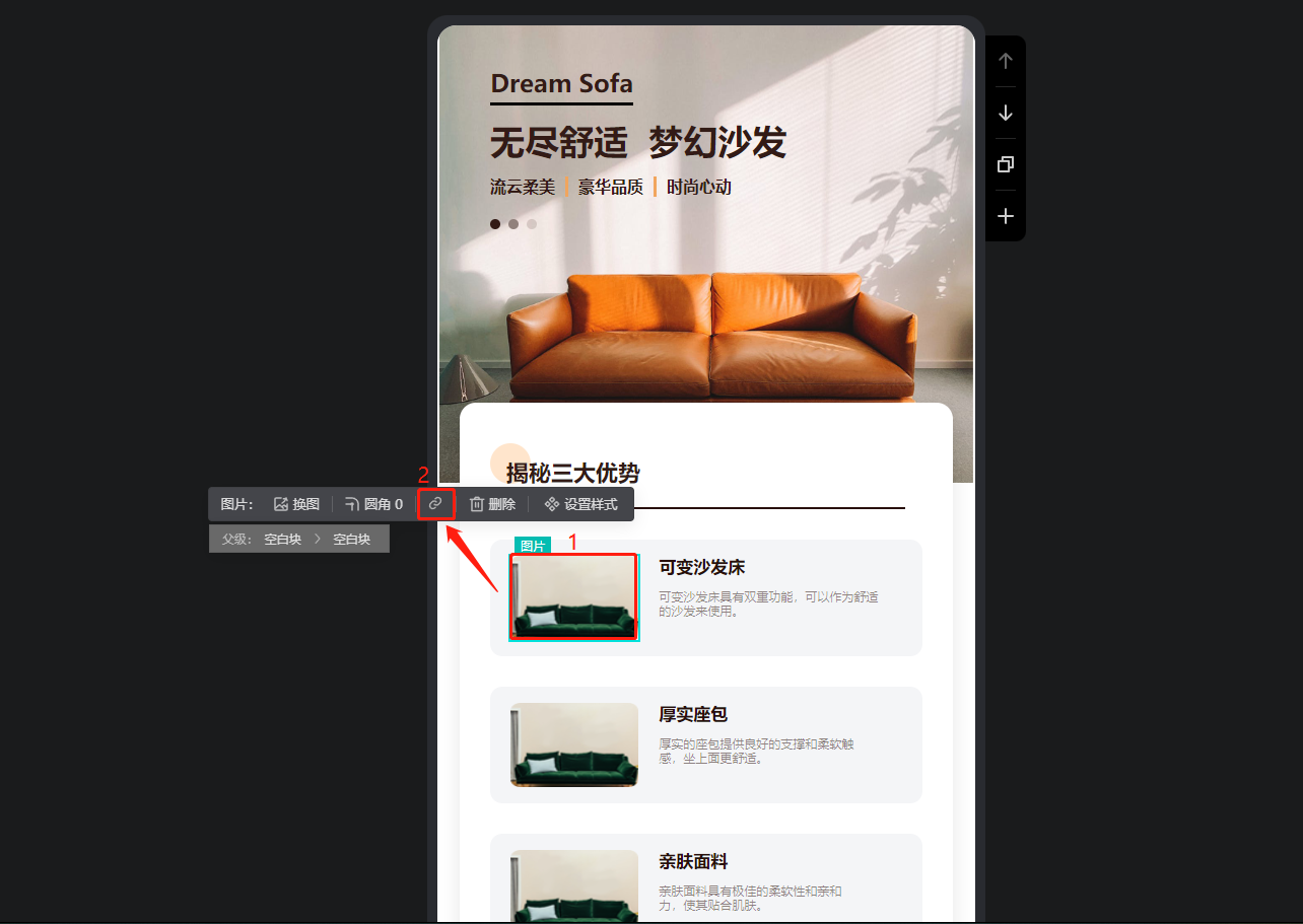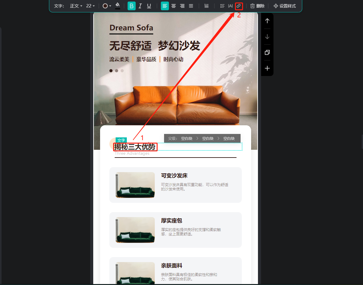 (1)選中微頁上的文字或者圖片,點(diǎn)擊【🔗】。