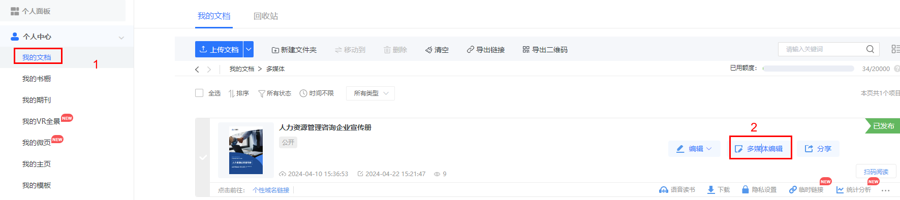 點(diǎn)進(jìn)【我的文檔】/【文檔】,選擇對應(yīng)電子書,點(diǎn)擊【多媒體編輯】/【內(nèi)容編輯】。