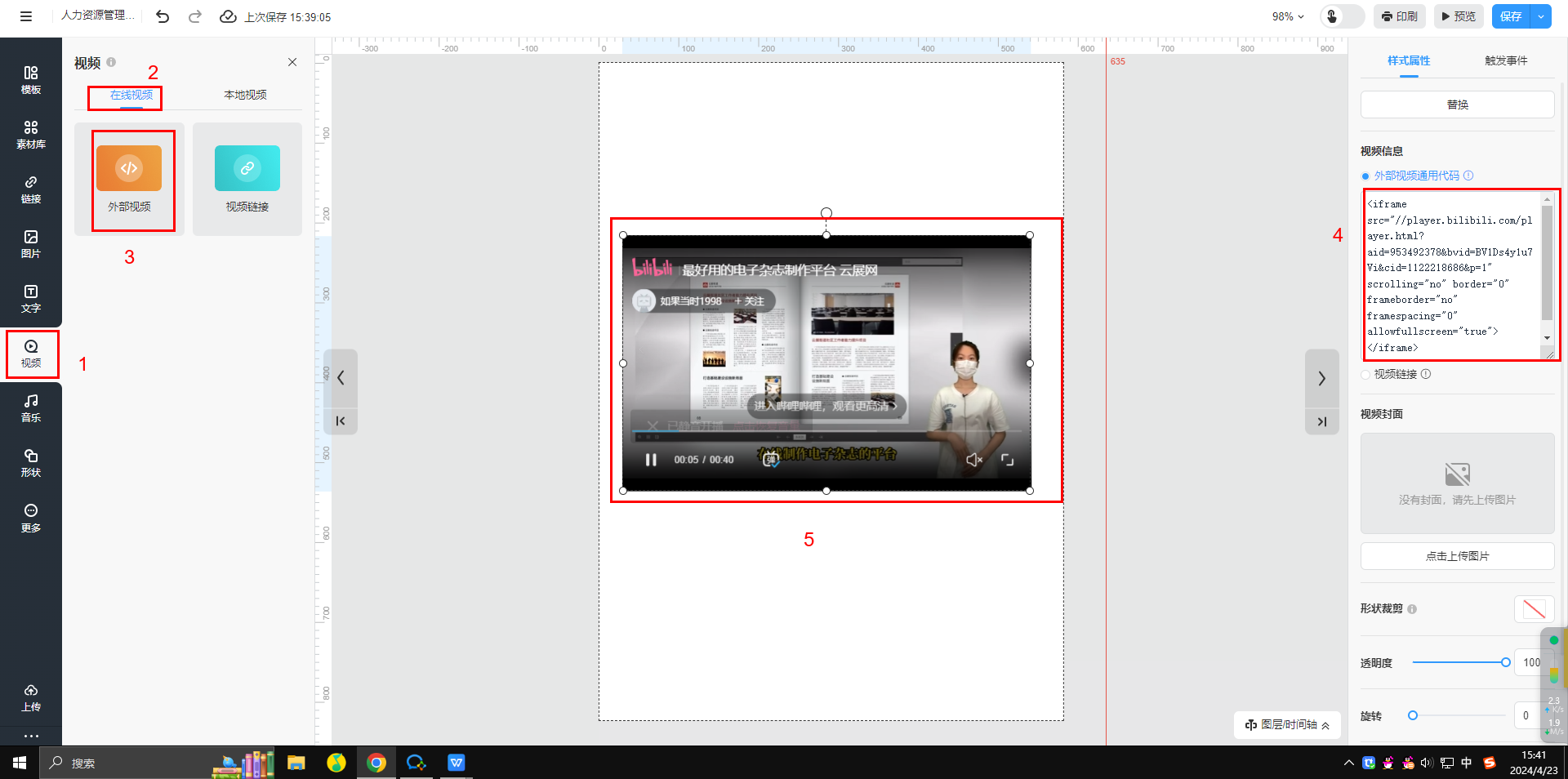 點(diǎn)擊【外部視頻】將視頻框放至畫布,把你的視頻上傳到第三方視頻網(wǎng)站如:bilibili,騰訊,愛奇藝等,上傳以后通過點(diǎn)擊分享來獲取內(nèi)嵌代碼,并輸入到【外部視頻通用代碼】里生成視頻,調(diào)整視頻框的位置和大小。