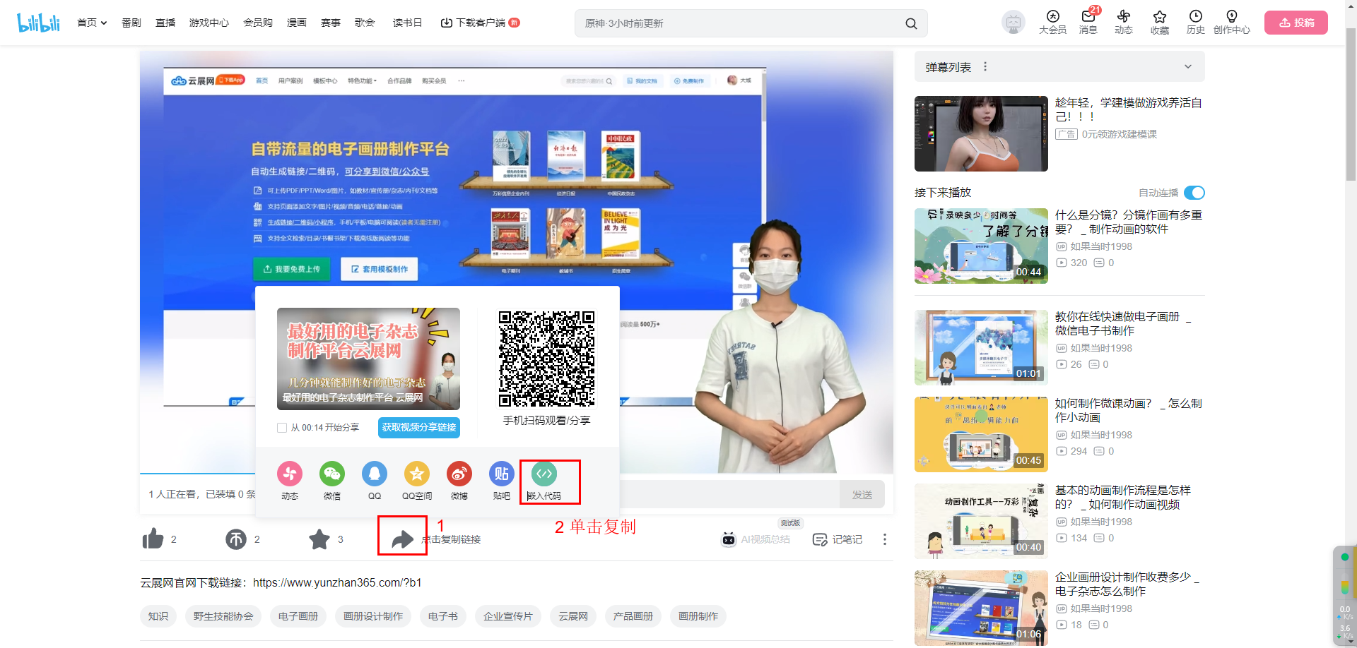 打開視頻網(wǎng)站,如嗶哩嗶哩,點(diǎn)擊分享按鈕,單擊復(fù)制嵌入代碼。