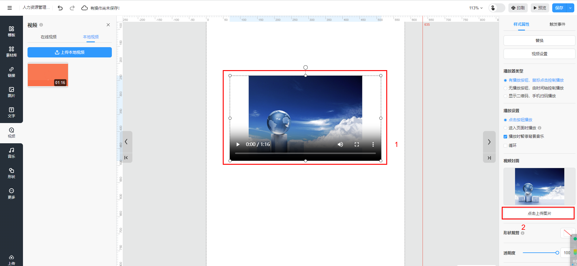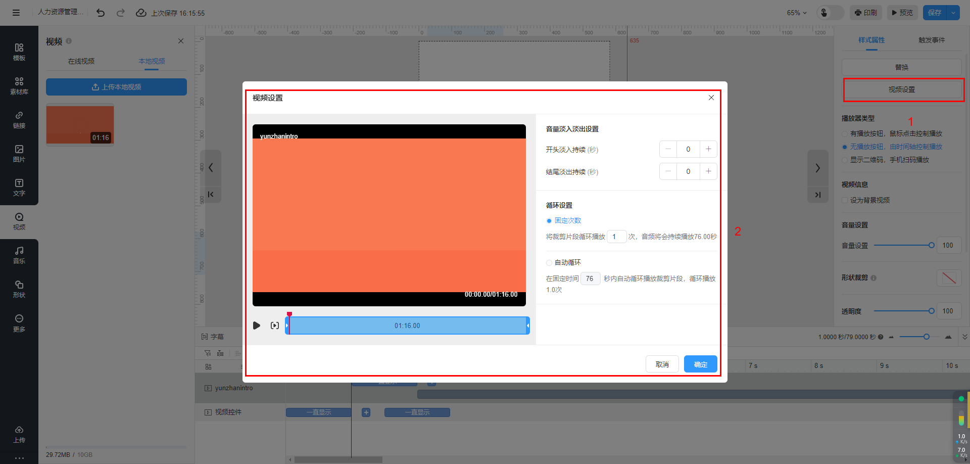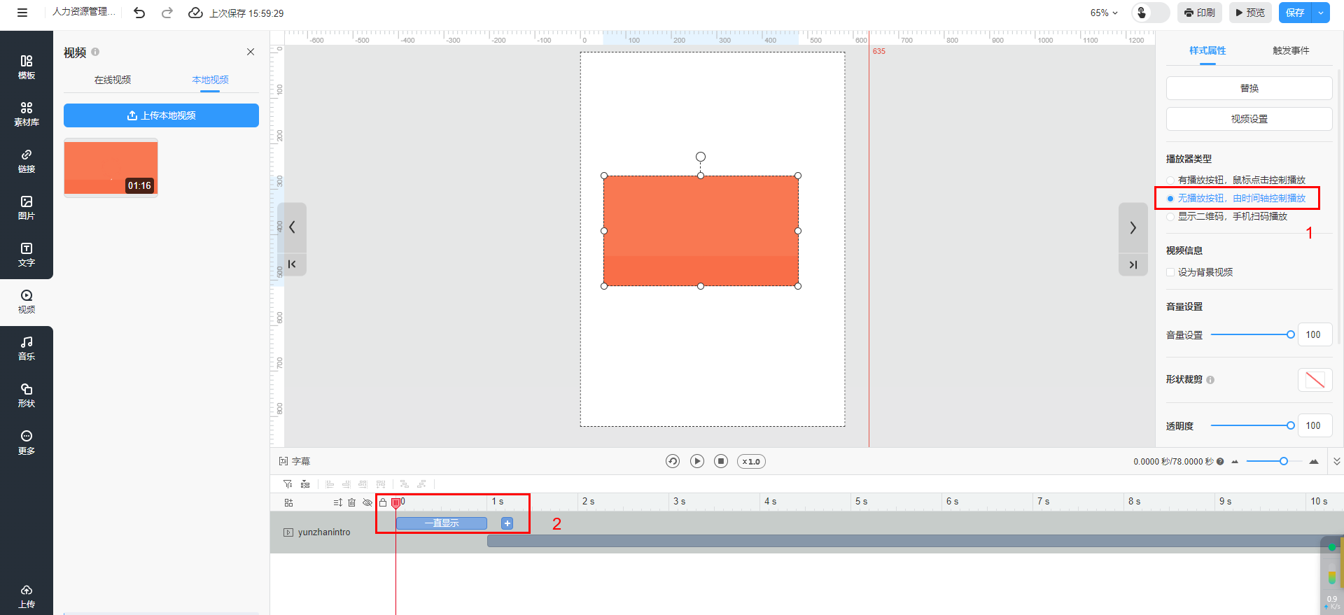 溫馨提示:【無播放按鈕,由時(shí)間軸控制播放】僅支持上傳本地視頻類型勾選。