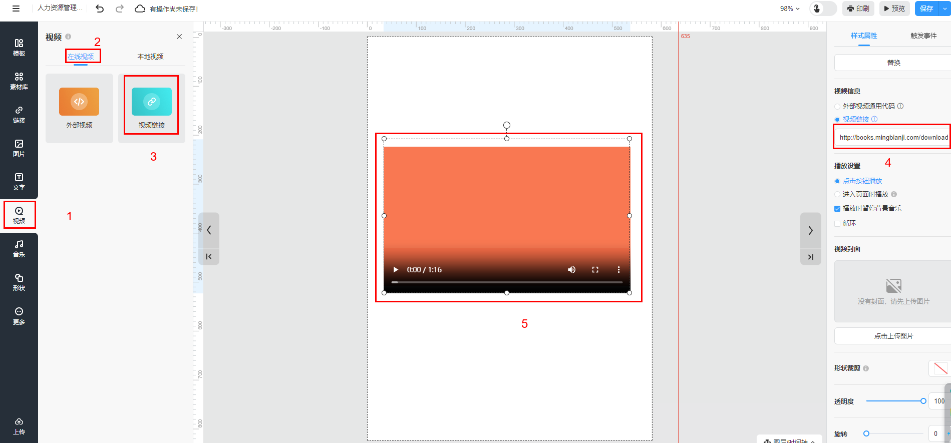 點(diǎn)擊【視頻鏈接】將視頻框放至畫布,調(diào)整視頻框的位置和大小,將你的視頻鏈接輸入到【視頻鏈接】