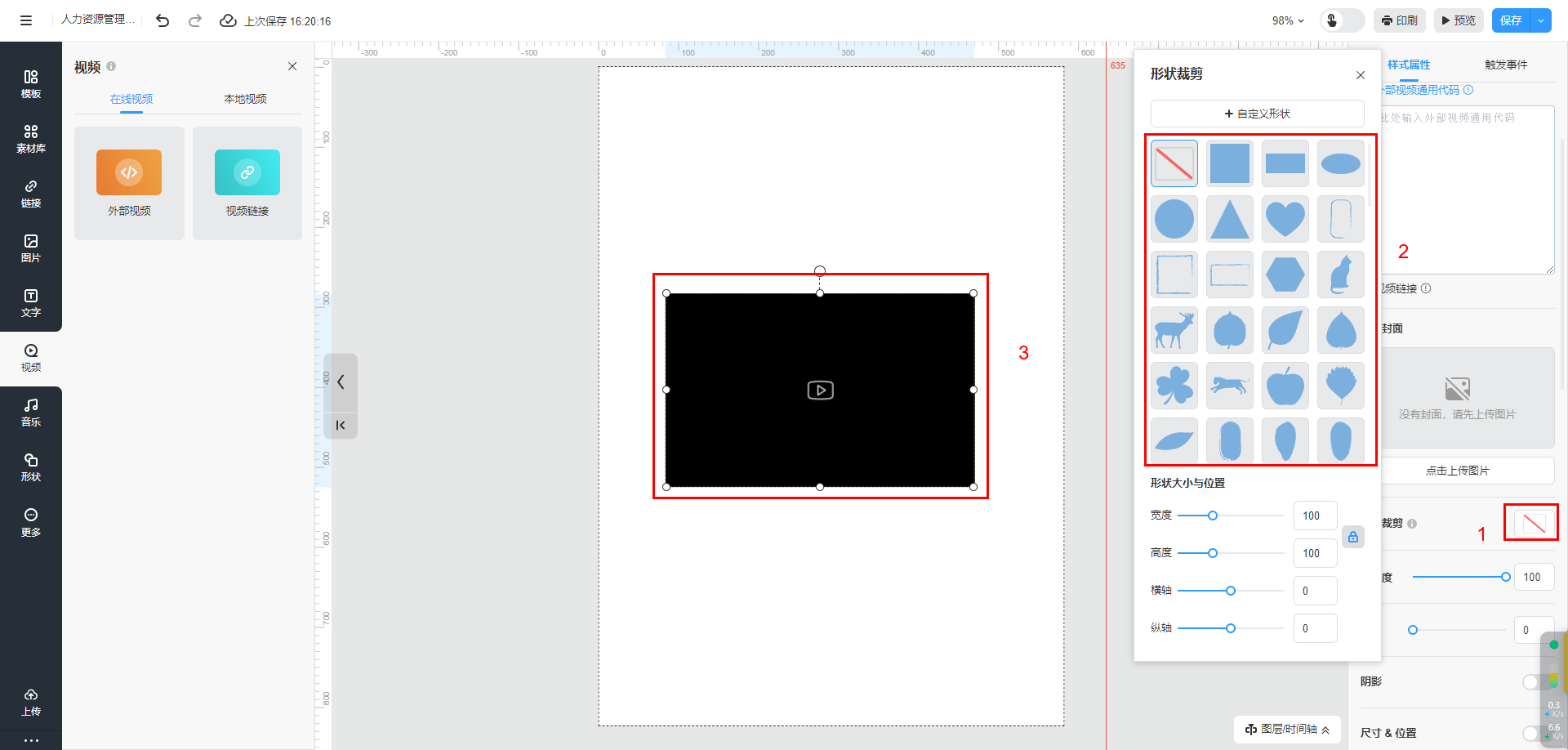 溫馨提示:在進(jìn)行形狀裁剪時(shí),請注意不要裁剪掉播放控件,或者你也可以選擇“進(jìn)入頁面時(shí)自動(dòng)播放”選項(xiàng),以便在使用形狀裁剪時(shí)保持播放的順暢。