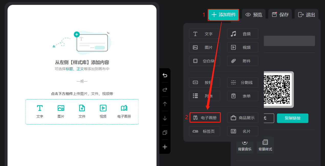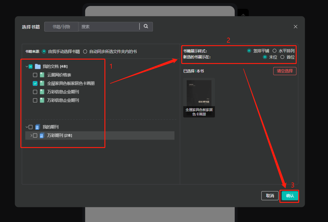 左邊勾選要添加的電子畫冊,右上角選擇【展示樣式】和【展示位置】,最后點擊右下角【確認(rèn)】。