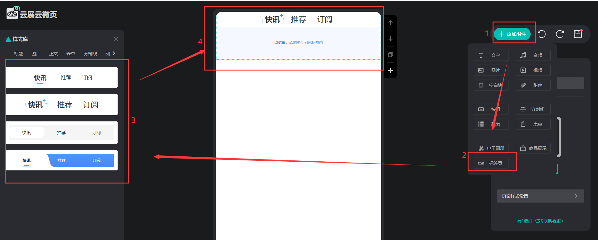 點(diǎn)擊【添加組件】,點(diǎn)擊【標(biāo)簽頁(yè)】,在左邊選擇標(biāo)簽樣式添加到微碼上。