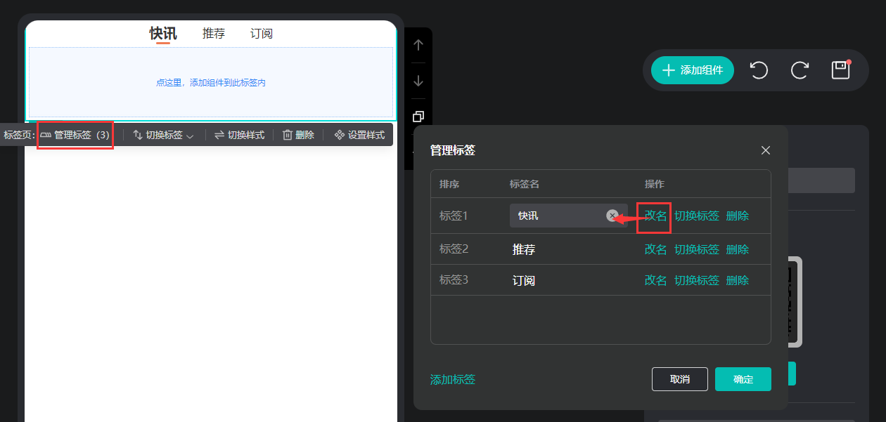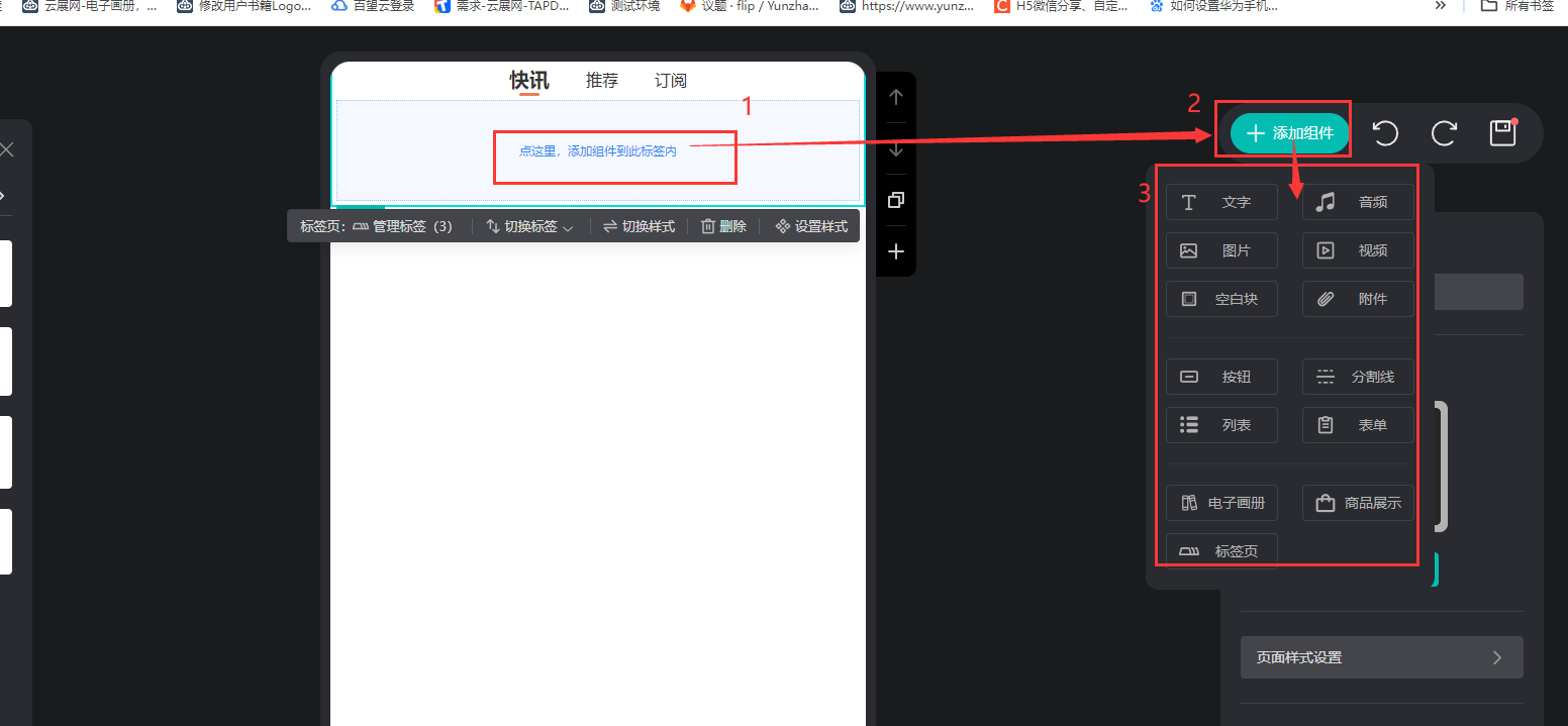 點(diǎn)擊【標(biāo)簽頁(yè)內(nèi)】,點(diǎn)擊【添加組件】,可以添加文字,圖片,音視頻,按鈕,表單等內(nèi)容在標(biāo)簽頁(yè)上。