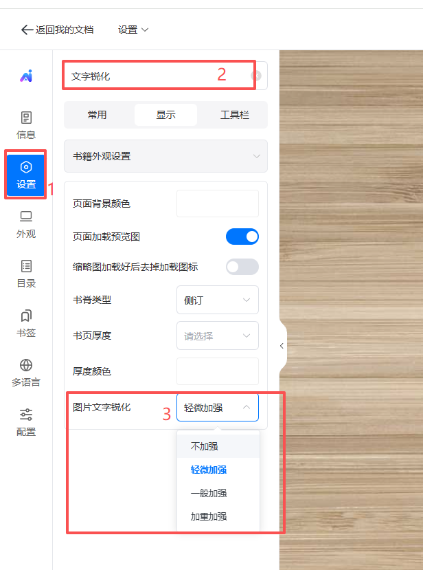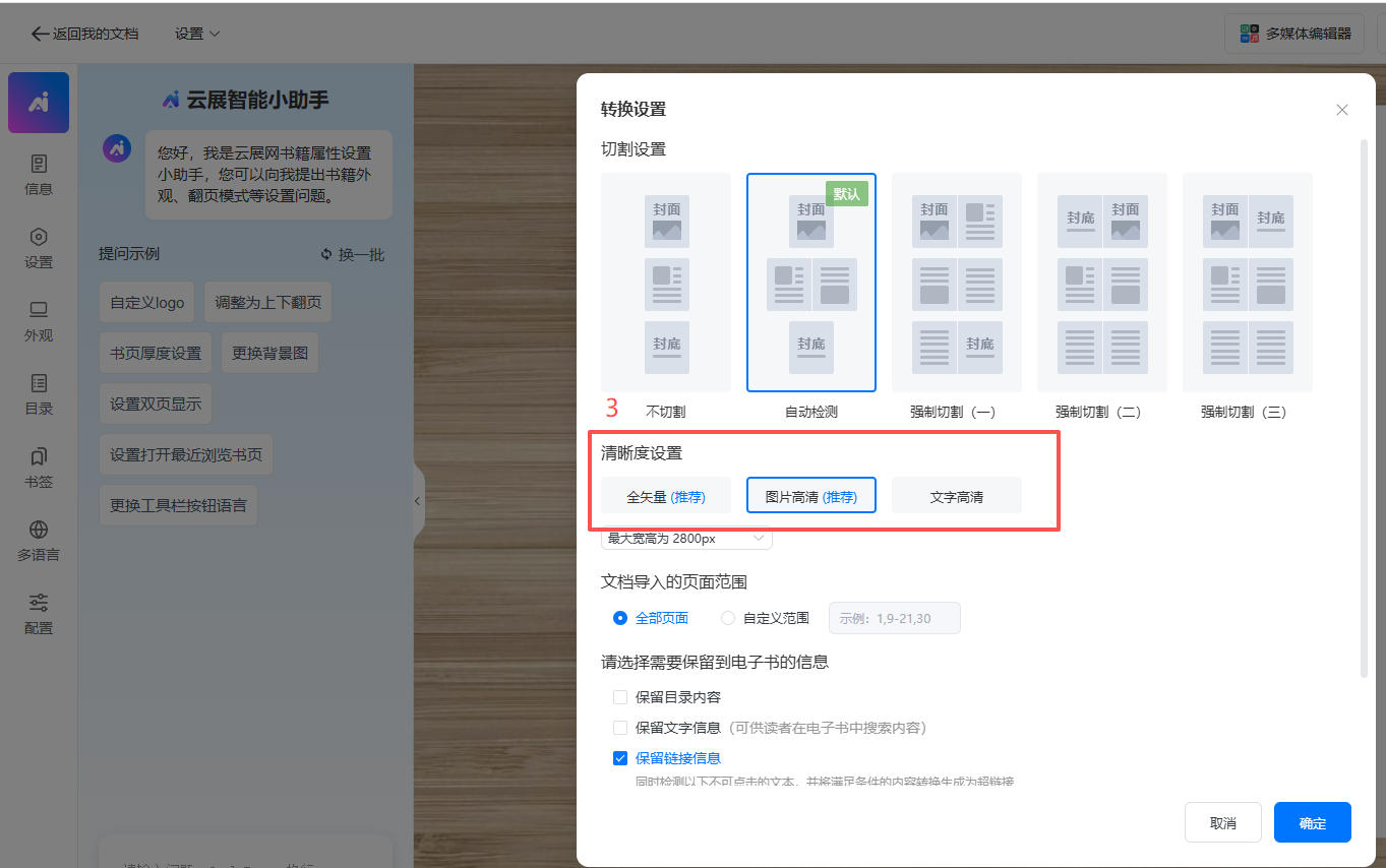 如果文檔本身清晰,但是在云展網(wǎng)上傳轉(zhuǎn)換以后模糊的話,可以設(shè)置如下三個選項來進行調(diào)節(jié)。