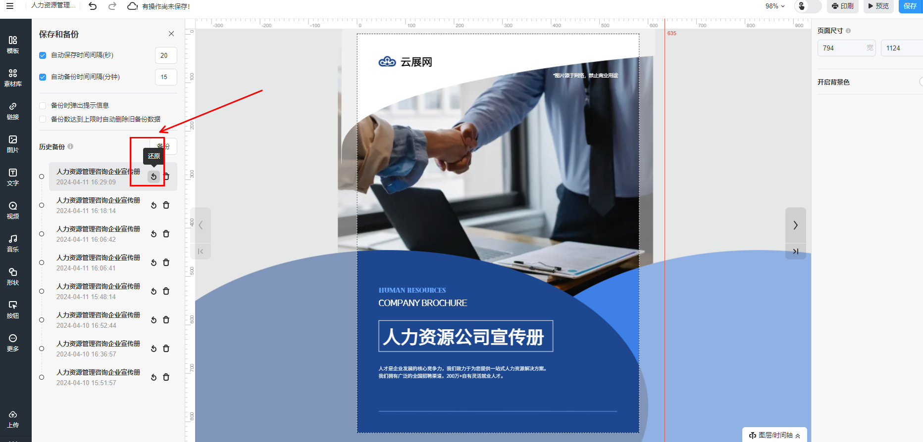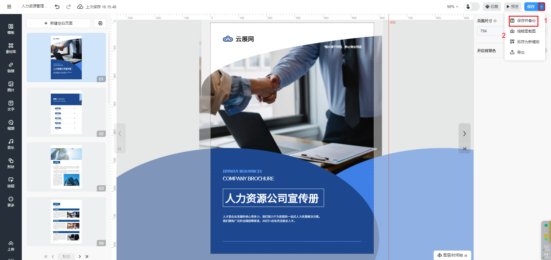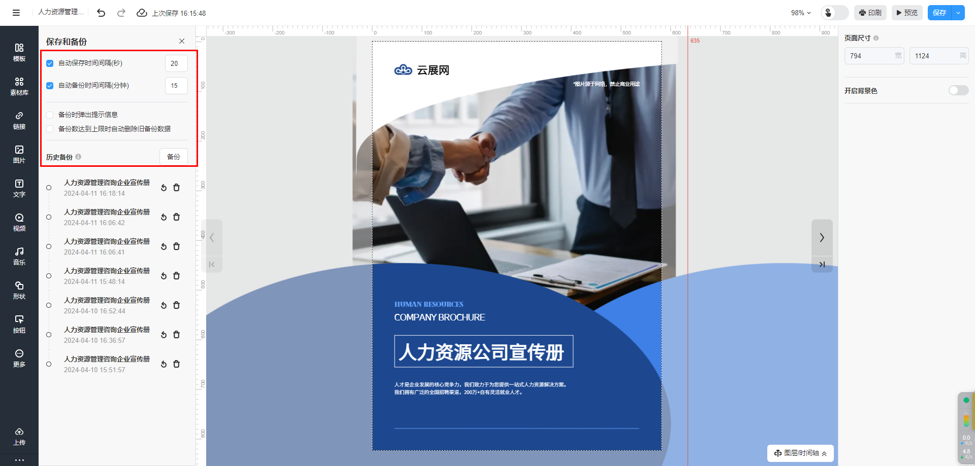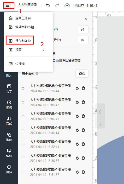 所有設(shè)置完成以后,在多媒體編輯器右上角點(diǎn)擊【保存并備份】。