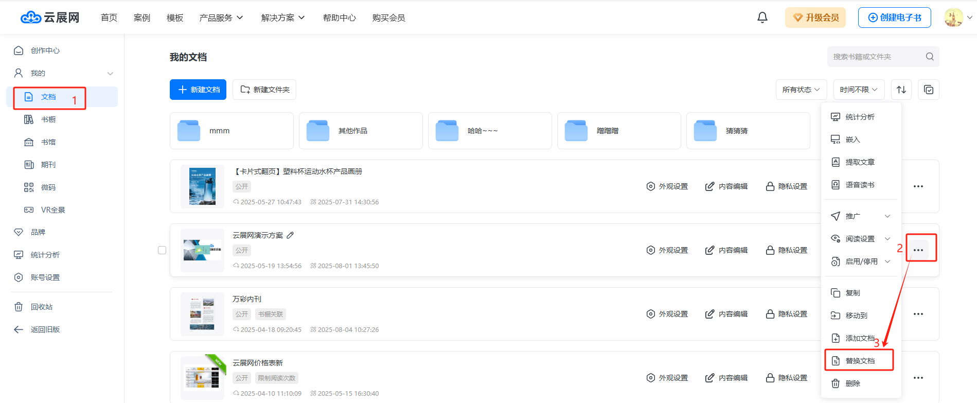 進(jìn)入【文檔】頁面,選擇需要替換內(nèi)容的書本,點(diǎn)擊右邊三個(gè)點(diǎn),點(diǎn)擊【替換文檔】,進(jìn)入替換文檔界面。
