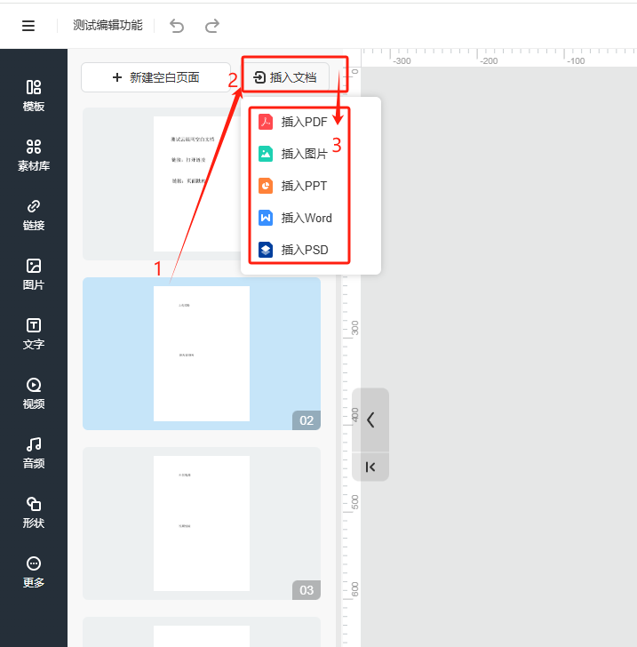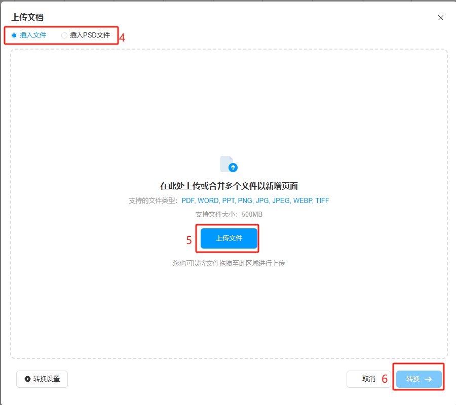 選擇需要替換的頁面,點(diǎn)擊【插入文檔】,選擇要插入的文件類型,然后點(diǎn)擊選擇文件上傳新文件,再選擇需要插入的文件進(jìn)行轉(zhuǎn)換。