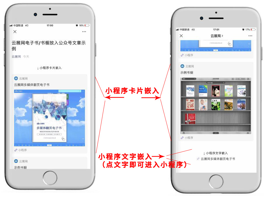 您可以把云展網(wǎng)生成的電子書/書櫥小程序分享到微信公眾號(hào)上,提高曝光率讓更多人看到,把電子書/書櫥小程序放到公眾號(hào)讓讀者閱讀,有三種展現(xiàn)形式。