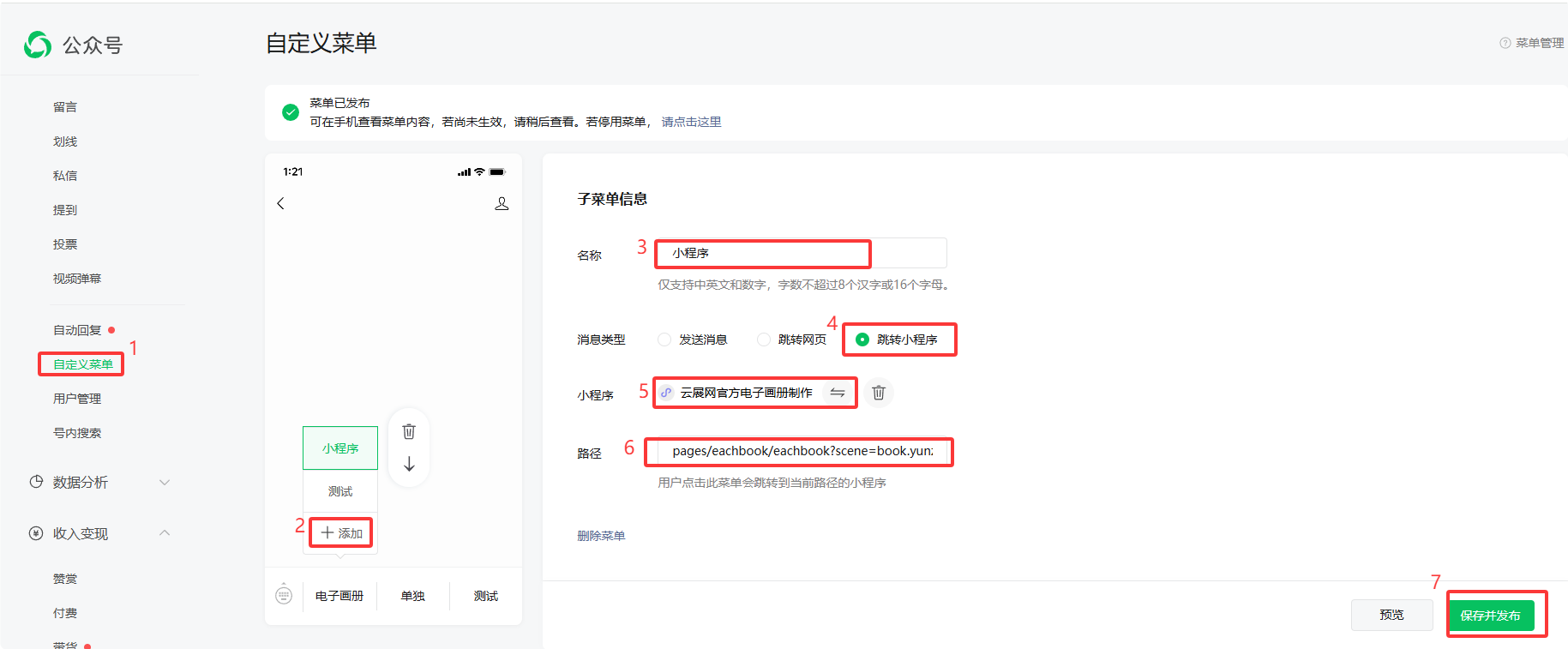 2、打開【自定義菜單】,點(diǎn)擊【添加】設(shè)置子菜單,輸入名稱,消息類型選擇跳轉(zhuǎn)小程序,選擇云展網(wǎng)官方電子畫冊(cè)制作小程序,輸入路徑地址