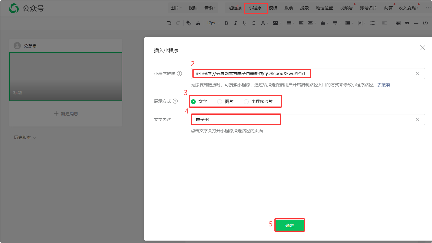 2、編輯公眾號(hào)文章時(shí),點(diǎn)一下頁(yè)面上的【小程序】,輸入小程序鏈接,選擇展示方式等,然后確定